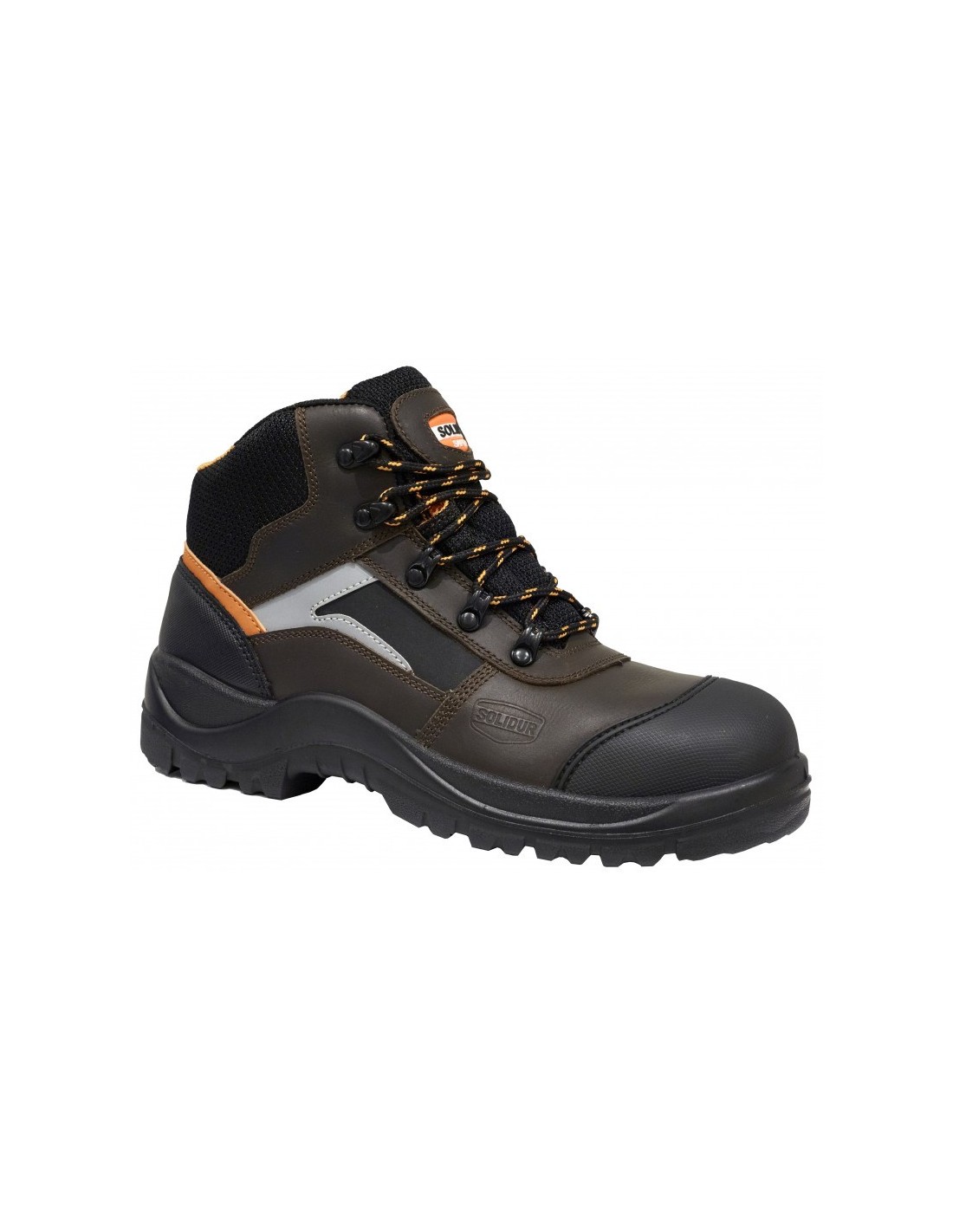 Semelle acier coque compositeDessus croûte de cuir hydrofugeDoublure textileSemelle polyuréthane double densitéCoquille composite anti-perforation inoxEN ISO 20345 : 2011 / S3 SRC