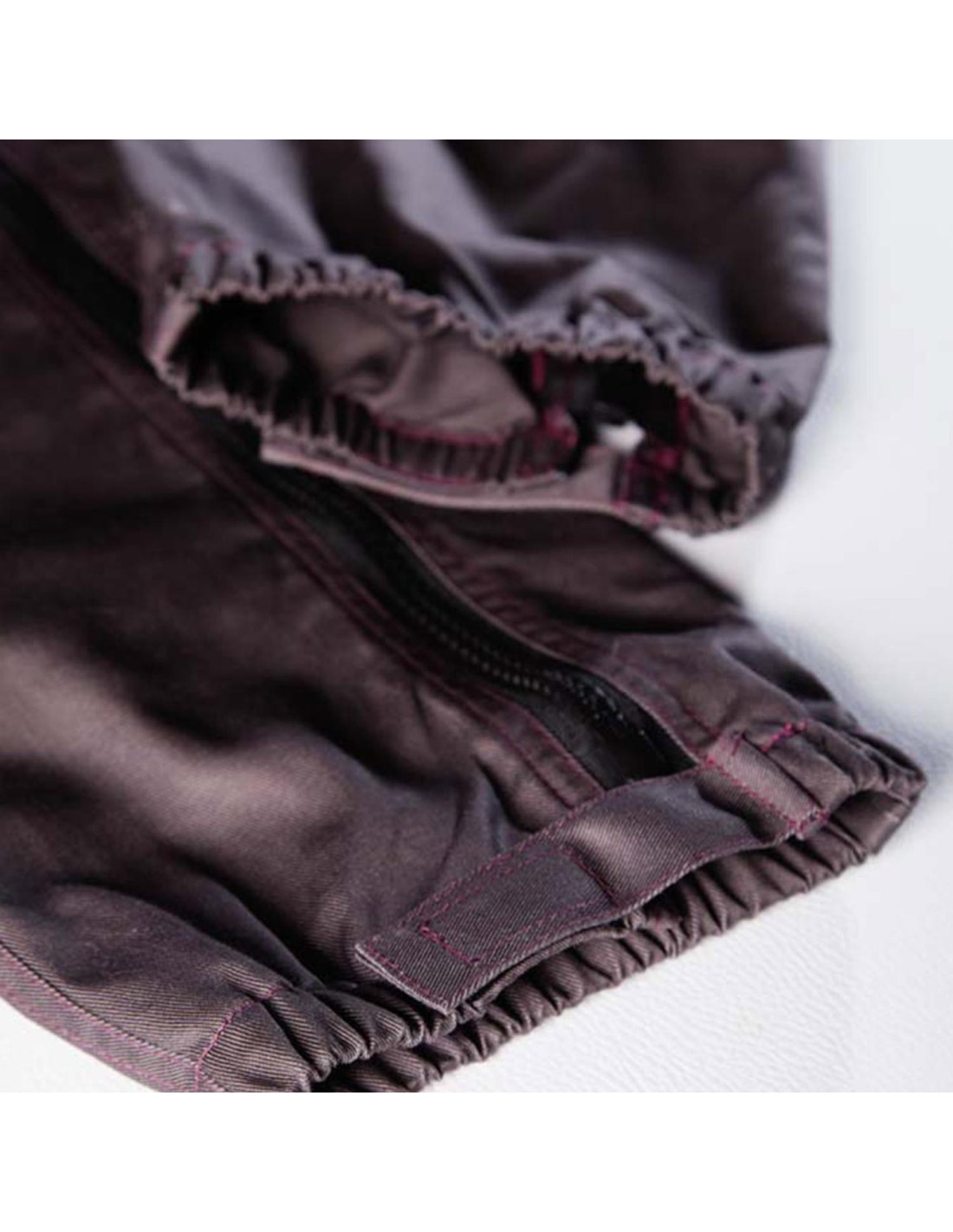 - Description : col montant , ouverture double zips , taille élastiquée cotés et dos , cotés-épaules et intérieur de col contrastés , 2 poches cavalières , 1 poche portable , poignets élastiqués , bas jambes élastiqués et zippés .