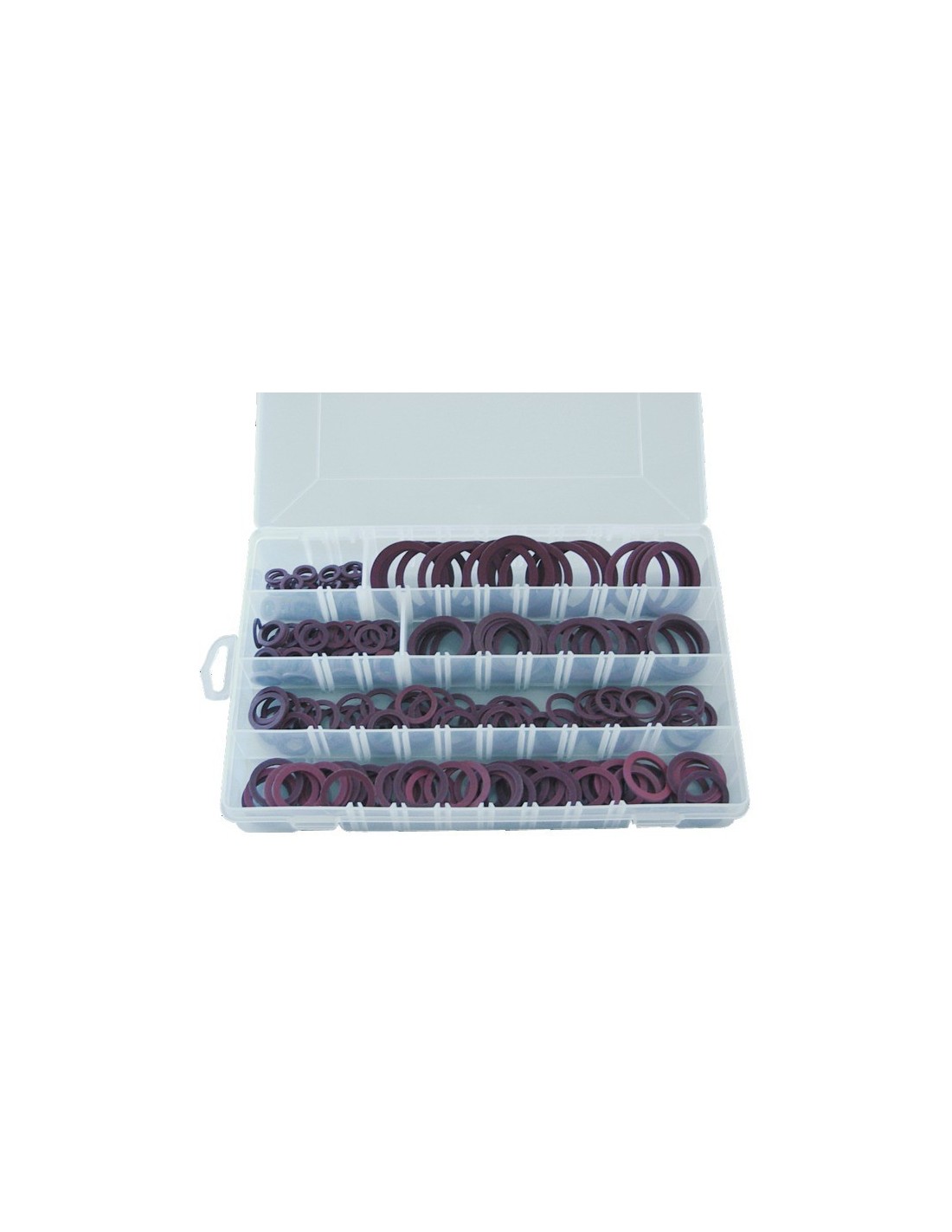 Ce coffret de 141 joints plats en caoutchouc, fibre et Klingerith (fibre aramide et lien élastomère).