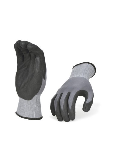 Gants tricotés sans couture 100% polyamide / Spandex. Jauge 15. Enduction mousse Nitrile antidérapant sur la paume et les extrémités des doigts (dos de la main aéré), poignet élastique et surfilé.