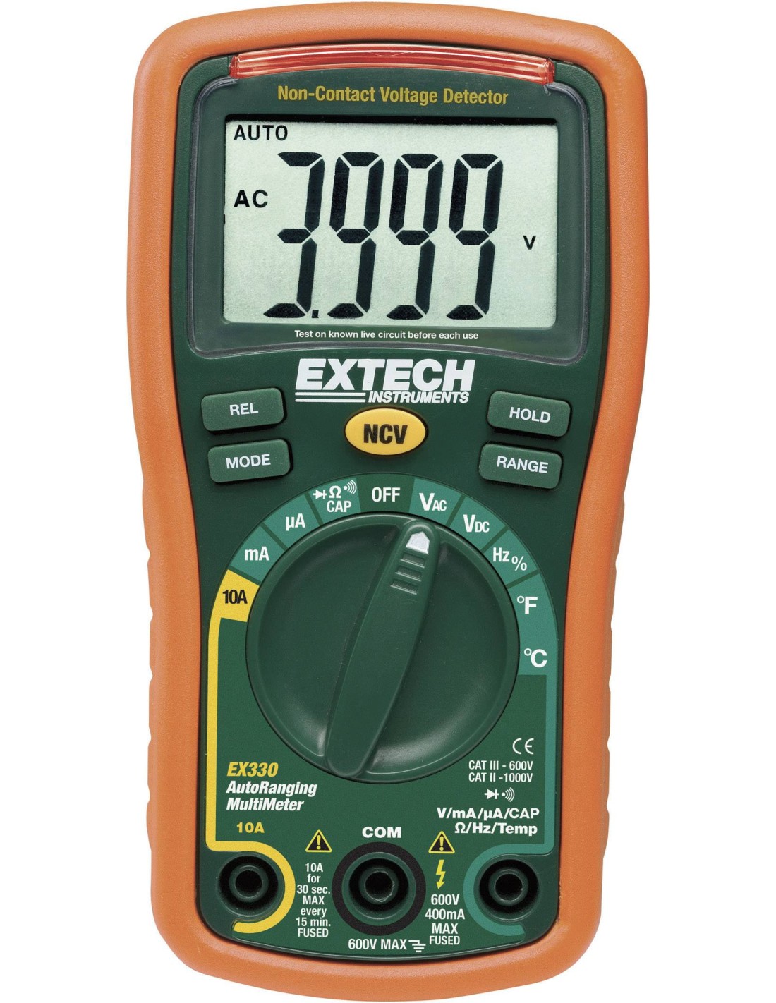 L’EX330 est un appareil de mesure compact à réglage automatique doté d’un très grand écran à 4 000 points et d’un détecteur de tension CA sans contact intégré. Les fonctions avancées incluent la fréquence, le rapport cyclique, la capacitance et la température, le test de diodes et la continuité. L’étui en caoutchouc protège l’appareil de mesure. Livré avec fils de test, une sonde de température type K, deux piles AAA et un pied inclinable.