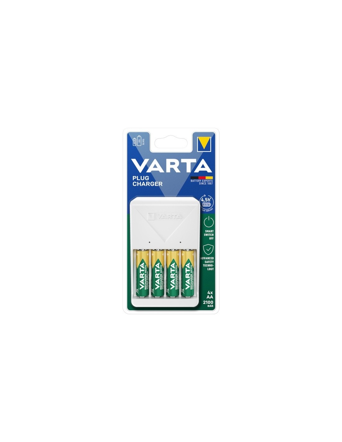 Le chargeur Varta plug avec indicateur de charge LED et arrêt de sécurité permet de charger 2 ou 4 piles AA, AAA simultanément -
