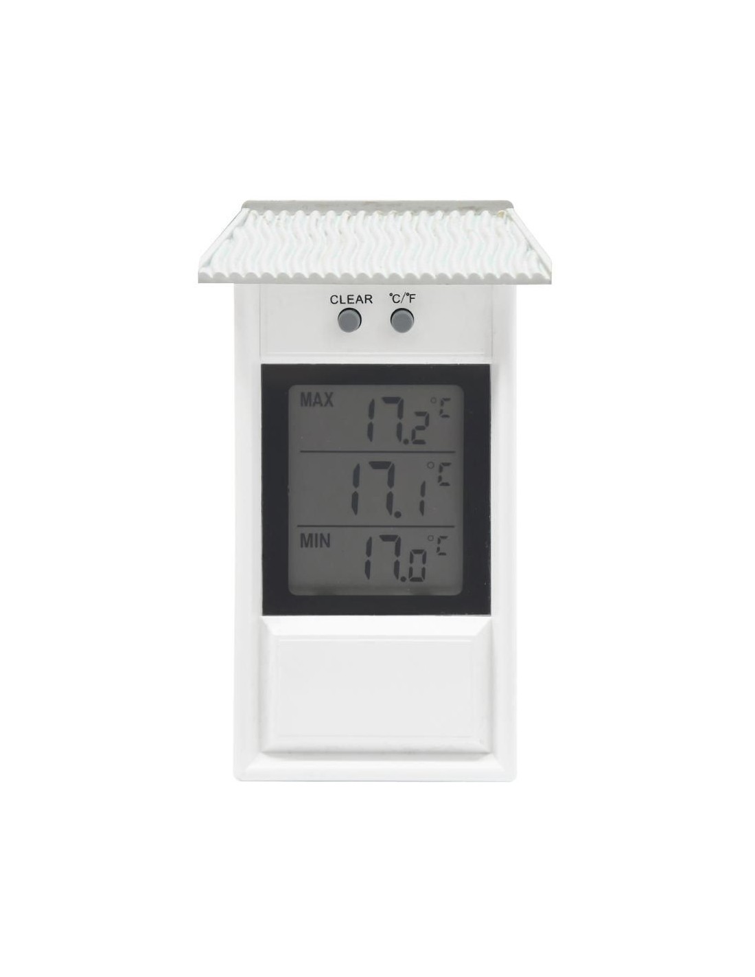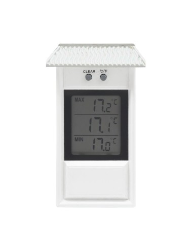 Thermomètre intérieur ou extérieur (IPX3) avec affichage digital des températures. Température °C/°F. Avec mini-maxi. Accroche murale. Fonctionne avec 1 pile AAA 1.5V fournie.